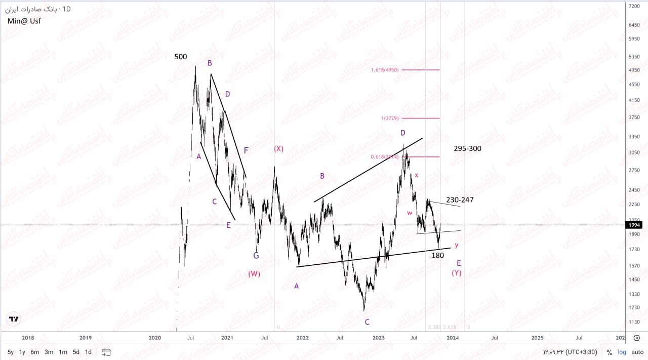 وبصادر یک الگوی ترکیبی را طی ۹۹ تا کنون طی کرده که به زودی این الگو زمانبر و فرسایشی تمام میشود و دوره رشد سهم شروع میشود. در انتهای مثلث هستیم و اخرین لگ یعنی E می باشد. با رعایت حد حمایت ۱۸۰ تومان با صرف کمی زمان می توان گین خوبی گرفت.۲۳۰-۲۴۷ تومان مقاومت نزدیک و سپس ۲۹۵-۳۰۰ تومان برای سهم دور از ذهن نخواهد بود.
