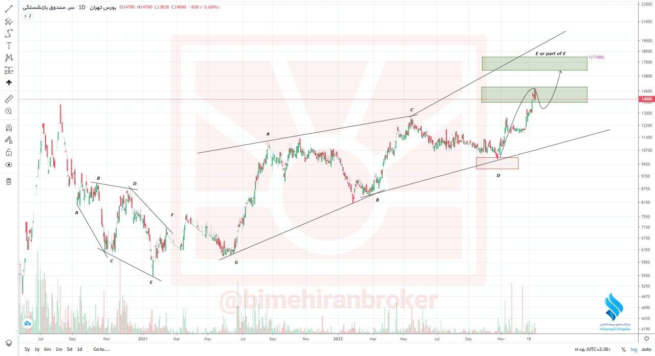بر این اساس؛ در تحلیل ارائه شده قبلی گفتیم با توجه به شباهت نمودار وصندوق با شاخص کل احتمال وجود یک دیامتریک بالاست. لذا با موقعیت قیمت را در انتهای شاخه D ارزیابی کردیم. همچنین اذعان داشتیم وصندوق برای تکمیل شاخه E یا حداقل بخشی از آن میتواند در گام نخست تا سطوح ۱.۰۰۰ و پس از آن تا محدوده ۱.۵۰۰ تومانی افزایش قیمت را تجربه کند که این امر با رشد ۴۵ درصدی قیمت محقق شد.