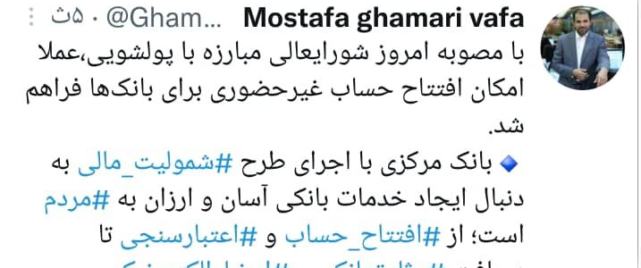 مصطفی قمریوفا، مدیرکل روابط عمومی بانک مرکزی جمهوری اسلامی ایران، امروز در صفحه شخصی خود با اشاره به مصوبه امروز شورای عالی مبارزه با پولشویی، نوشت که: با مصوبه امروز شورای عالی مبارزه با پولشویی، عملا امکان افتتاح حساب غیرحضوری برای بانکها فراهم شد.